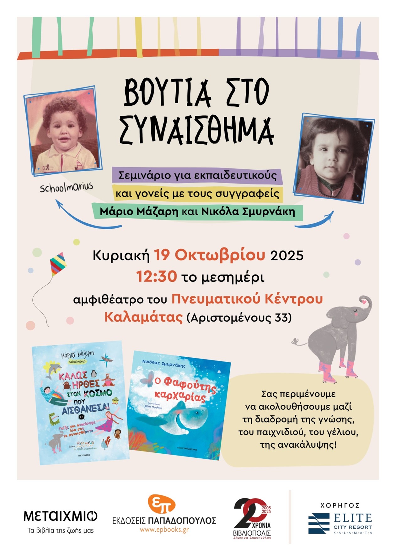 Το βιβλιοπωλείο ΒΙΒΛΙΟΠΟΛΙΣ, οι εκδόσεις ΠΑΠΑΔΟΠΟΥΛΟΣ και οι εκδόσεις ΜΕΤΑΙΧΜΙΟ σε προσκαλούν σε ένα διαφορετικό σεμινάριο που θα πραγματοποιηθεί από τους συγγραφείς Μάριο Μάζαρη και Νικόλα Σμυρνάκη την Κυριακή 19 Οκτωβρίου 2025, στις 12:30 το μεσημέρι, στο αμφιθέατρο του Πνευματικού Κέντρου Καλαμάτας (Αριστομένους 33).