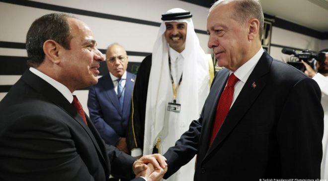 Όλο και πιο αυτονόητες, όλο και πιο θερμές γίνονται οι χειραψίες του Αιγύπτιου προέδρου Αμπντέλ Φατάχ Αλ Σίσι με τον Τούρκο ομόλογό του Ρετζέπ Ταγίπ Ερντογάν. Για δέκα ολόκληρα χρόνια οι δύο άνδρες διατηρούσαν μάλλον εθχρικές σχέσεις, ήταν εμφανές ότι ο ένας δύσκολα ανέχεται την παρουσία του άλλου. Μία πρώτη διστακτική προσέγγιση έγινε στο Κατάρ, πριν από έναν χρόνο, στο περιθώριο του Παγκοσμίου Κυπέλλου Ποδοσφαίρου. Ήταν μία σύντομη χειραψία. Ακολούθησαν όμως δύο ακόμη συναντήσεις, αρχικά στη σύνοδο των G20 στο Νέο Δελχί τον Σεπτέμβριο και ακολούθως στη σύνοδο κορυφής του Οργανισμού Ισλαμικής Συνεργασίας στο Ριάντ πριν λίγες εβδομάδες.